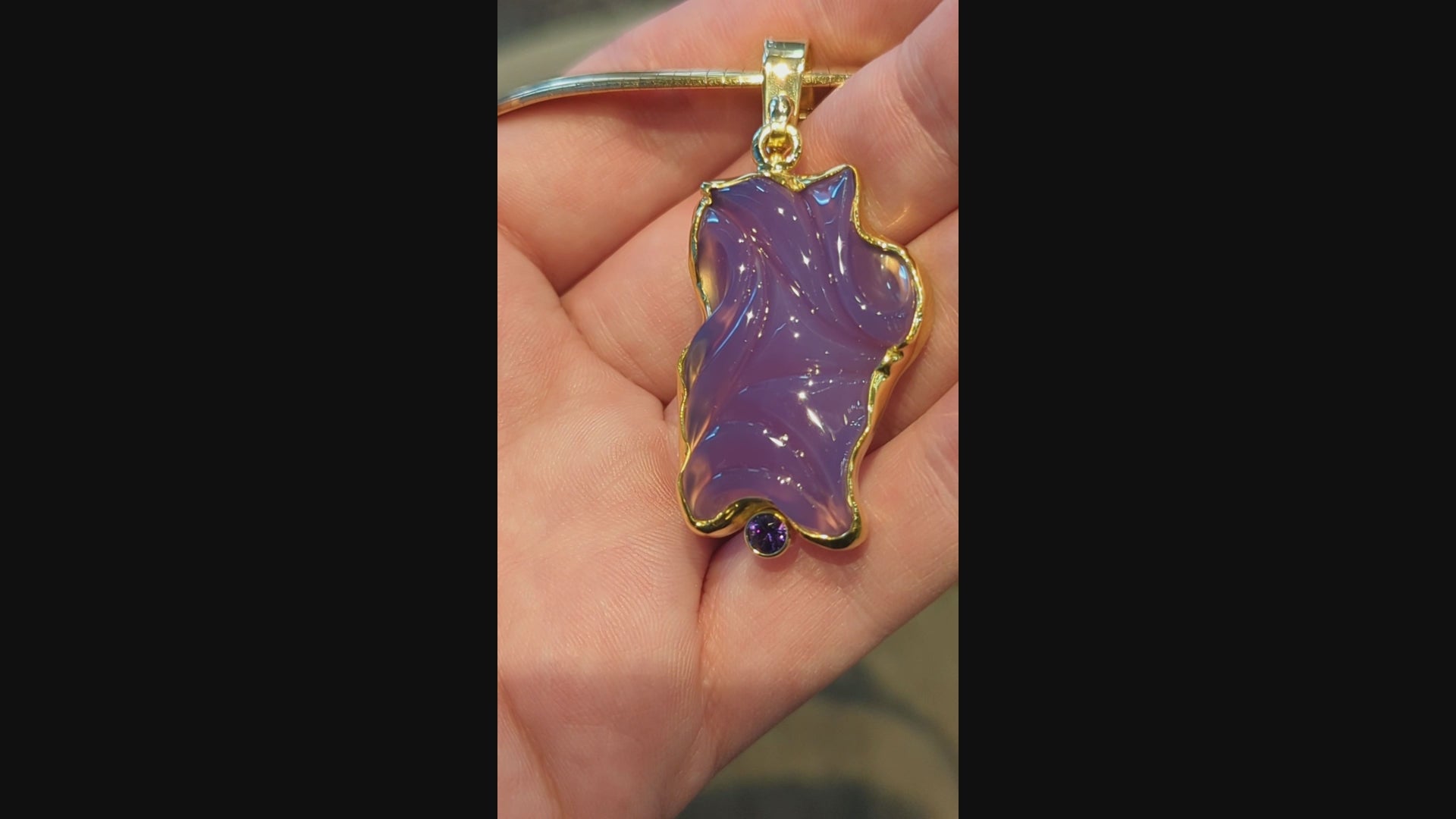 This one-of-a-kind gracefully curving freeform lilac chalcedony was cut by acclaimed lapidary (gem cutter) Steve Walters. Phil fell in love with this soft purple carved gemstone at the Tucson gem show, paired it with a purple sapphire and set it in a simple bezel. The enhancer bail opens to fit over pearls or beads as well as a variety of chains.